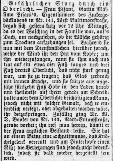After looking at a map, although my 2nd great-grandmother was a German immigrant and I had found several members of her family in Der Deutsche Correspondent, I believe this event was covered in the German paper because it was unusual. And because of proximity. The location of the shop at 141 W. Baltimore Street is now 209 E. Baltimore Street, 2 blocks from the location of the paper’s building at E. Baltimore and Post Office Avenue (now Customs House Avenue).
