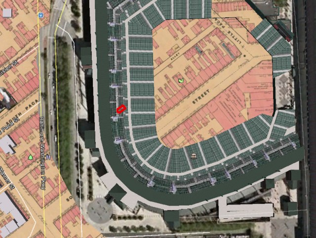 I was able to overlay that map onto Google Earth and low and behold the house was on the current 3rd base side of Oriole Park.