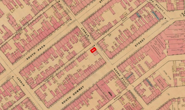 | 136 Little Green Street (Red Box) from Papenfuse: Atlases and Maps of Baltimore City and County, 1876-1915 & Block Maps as of April, 2005. Image: bc_ba_atlases_1876_1915-0638 |