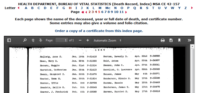 I will not be able to obtain the death certificates anytime soon. They are $25.00/certificate when ordered on-line (they are certified). So I like to wait until I have quite a few to get and then I go in person to the Archives in Annapolis, Maryland.