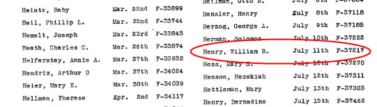 Could his death certificate somehow have been misfiled? I do a quick search of the Baltimore Sun for July 12-16, 1937 and do in fact find a death notice for William R. Henry that died on July 11th. There is mention of his parents (names that are not familiar) and he to be buried in Ohio. This isn’t my William.