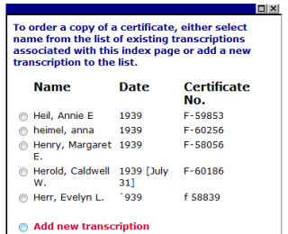 At the top of the search page I will click on the link to “Order a copy of a certificate from this index page”